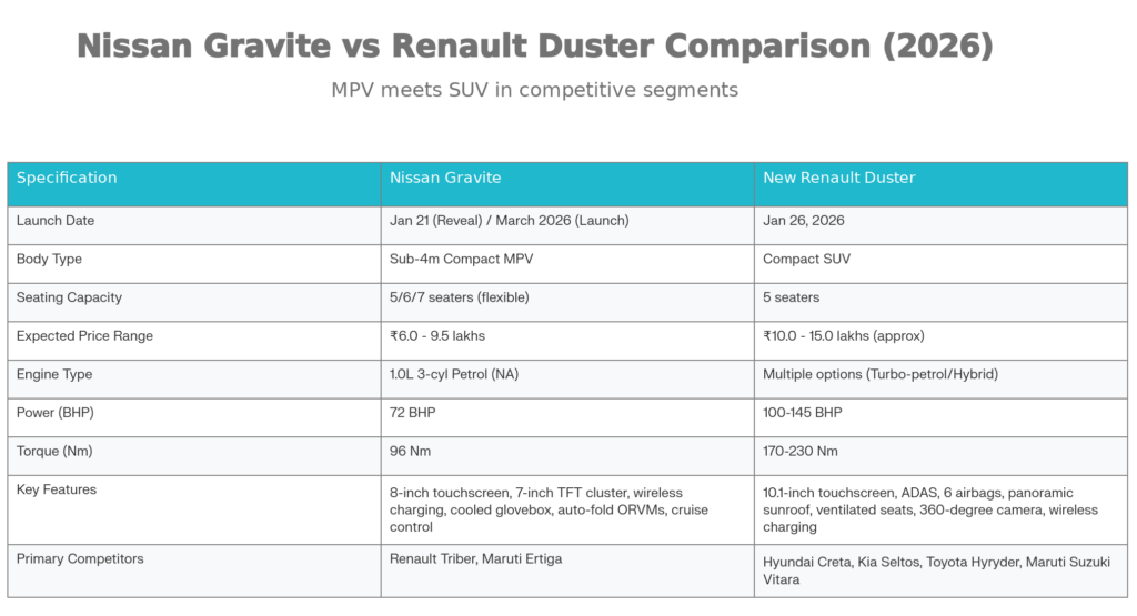 Nissan Gravite MPV vs New Renault Duster: Complete Specifications Comparison (January 2026 Launches)