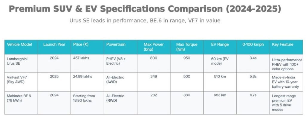 India’s automotive landscape is undergoing a seismic shift toward premium performance and electrification. The convergence of three distinct market forces—ultra-luxury performance hybridisation, mid-premium electric SUV accessibility, and indigenous EV manufacturing—is creating an unprecedented moment for luxury vehicle buyers. The Lamborghini Urus SE, VinFast VF7, and Mahindra BE.6 represent three different yet complementary approaches to capturing this expanding market, each targeting distinct buyer personas while signalling where India’s automotive future is heading.